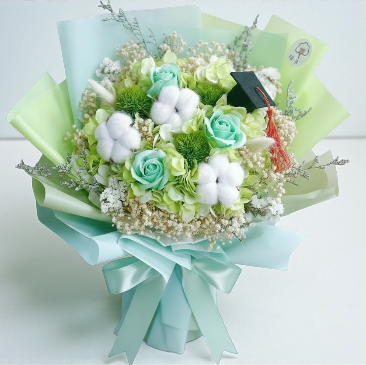 👉🏻乾👈🏻 棉子經典花束丨玫瑰棉花花束丨6支主花丨綠色丨 經典(中花束)丨畢業花束丨大學畢業花束