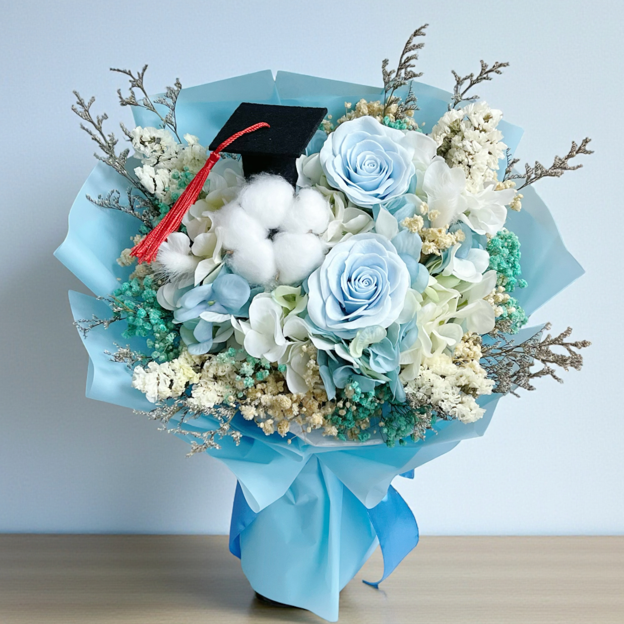 👉🏻乾👈🏻 棉子經典花束丨玫瑰棉花花束丨6支主花丨藍色丨 經典(中花束)丨畢業花束