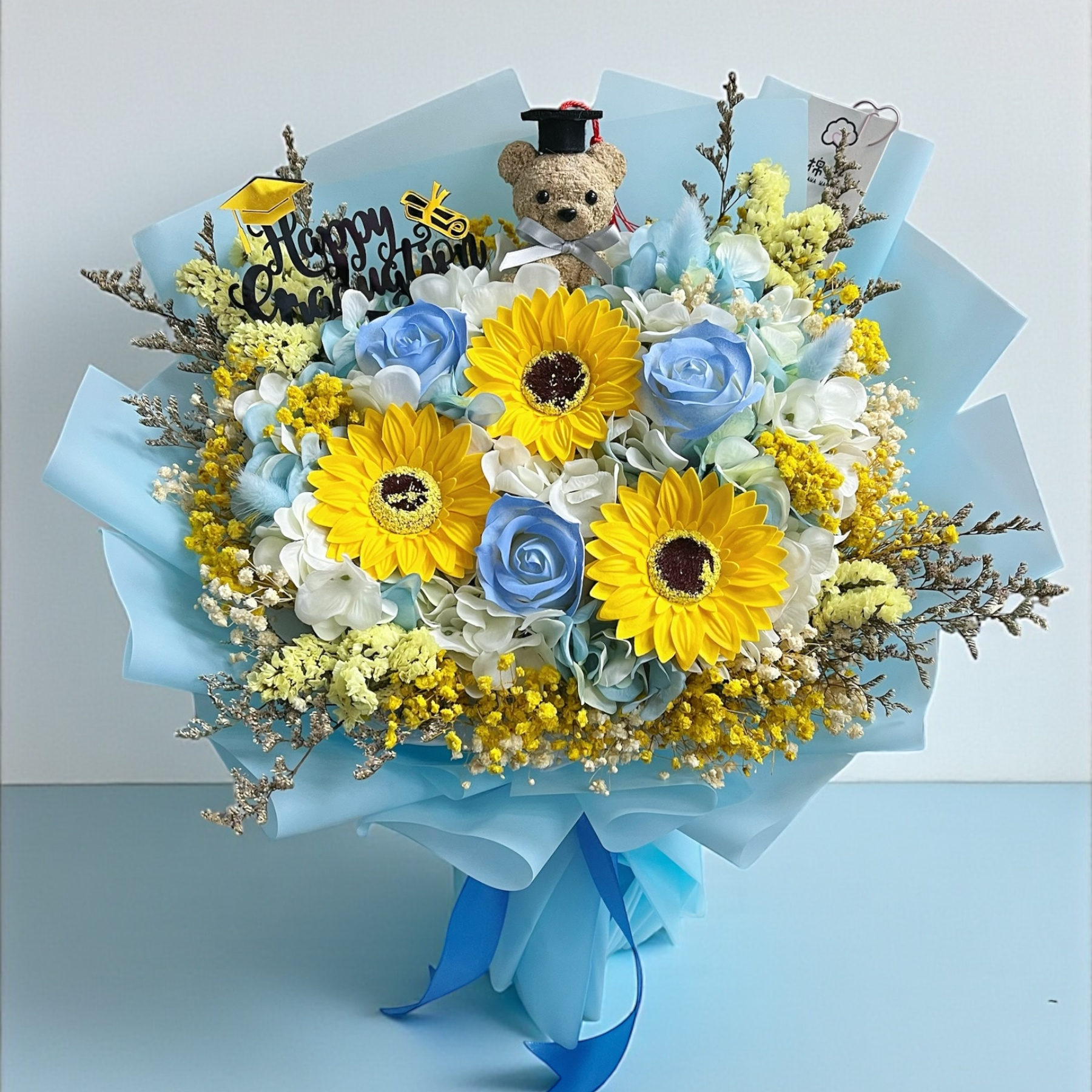 👉🏻乾👈🏻 棉子經典花束丨玫瑰太陽花花束丨6支主花丨藍色丨碎冰藍玫瑰 經典(中花束)