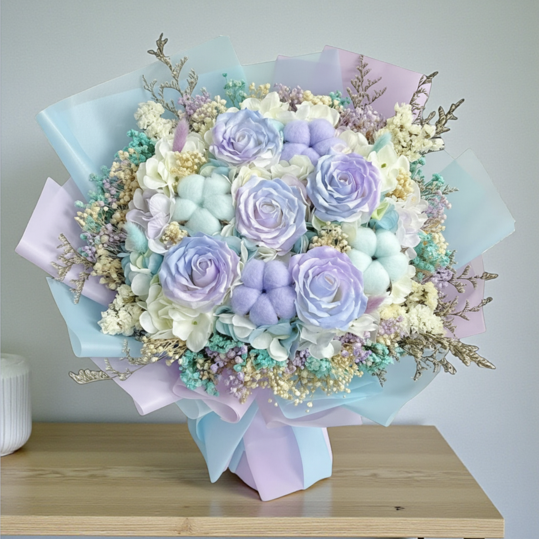紫藍色夢幻花束 - 罕有紫藍棉花的浪漫之禮 產品特色 🌸 紫藍色系統一設計 這束花以優雅的紫藍色調為主題,從淡紫到淺藍的層次變化,彷彿將整個天空的夢幻與浪漫融入其中,營造出獨特的視覺享受。 🌸 精緻花材組合 紫藍色玫瑰:象徵夢幻與真摯 5瓣罕有棉花:獨特點綴,象徵稀有與珍貴 精緻乾燥花:點綴自然風情 🎀 溫柔包裝設計 紫藍色包裝紙,質感柔軟 同色系緞帶綑綁 簡約而不失質感的包裝風格 紫藍色花束的象徵意義 🌸 夢幻與浪漫 紫藍色象徵著夢幻、浪漫與溫柔,是表達愛意的完美顏色。 🌸 稀有與珍貴 5瓣罕有棉花象徵著稀有與珍貴,代表送禮者對接收者的重視。 🌸 希望與夢想 紫藍色代表希望與夢想,能為人帶來積極正面的能量,鼓勵人們追逐夢想。 適合場合 浪漫約會 生日祝福 感謝致意 慰問與鼓勵 表達真摯情感 立即擁有這束充滿夢幻與浪漫的紫藍色花束,讓愛意如紫藍色般稀有而真摯!