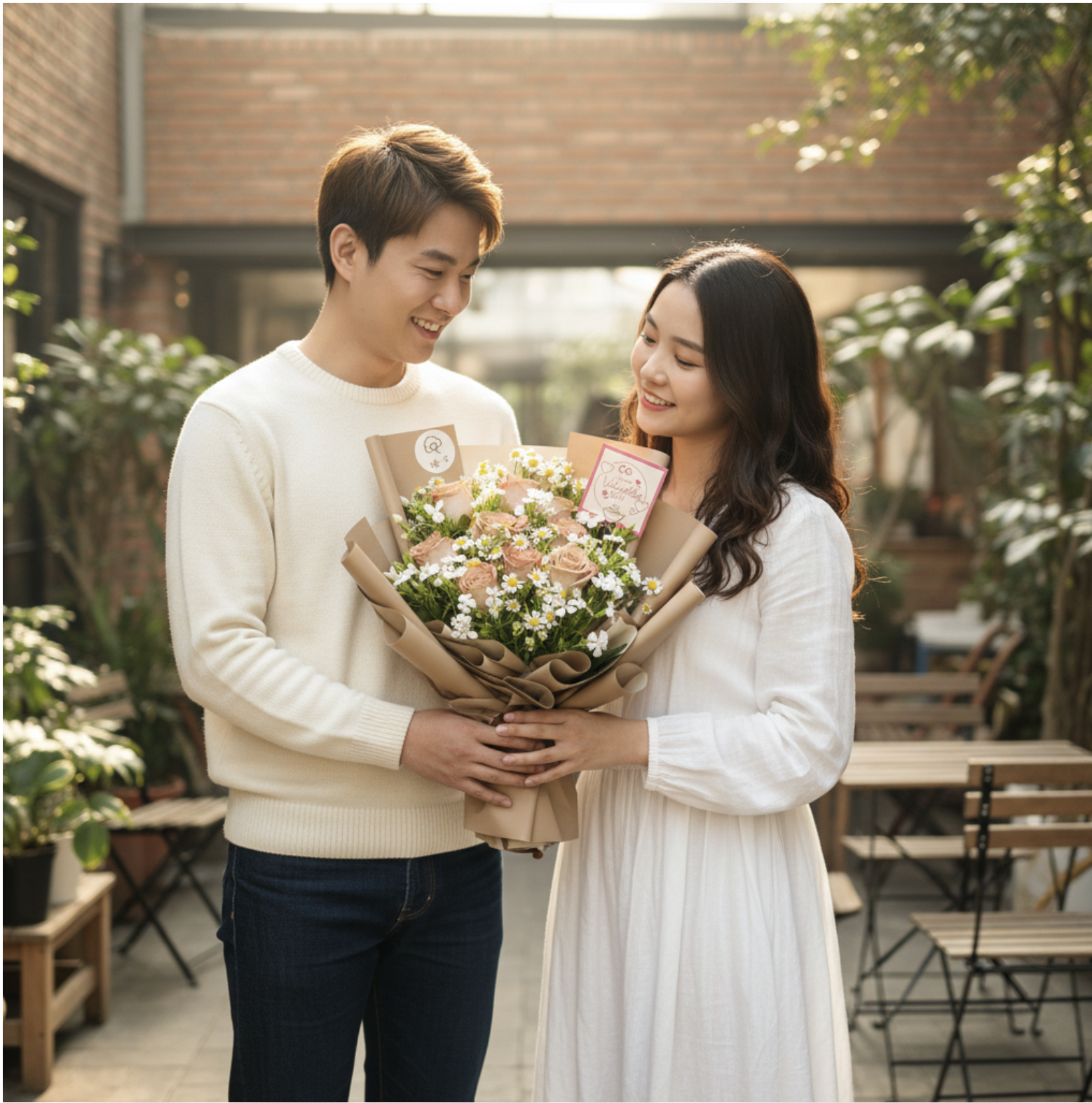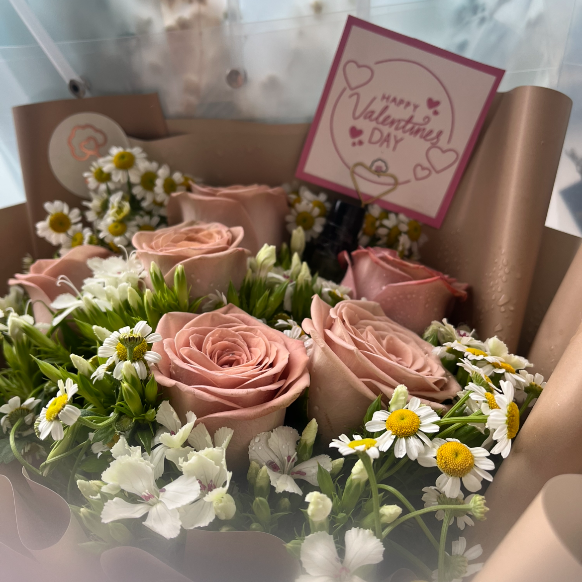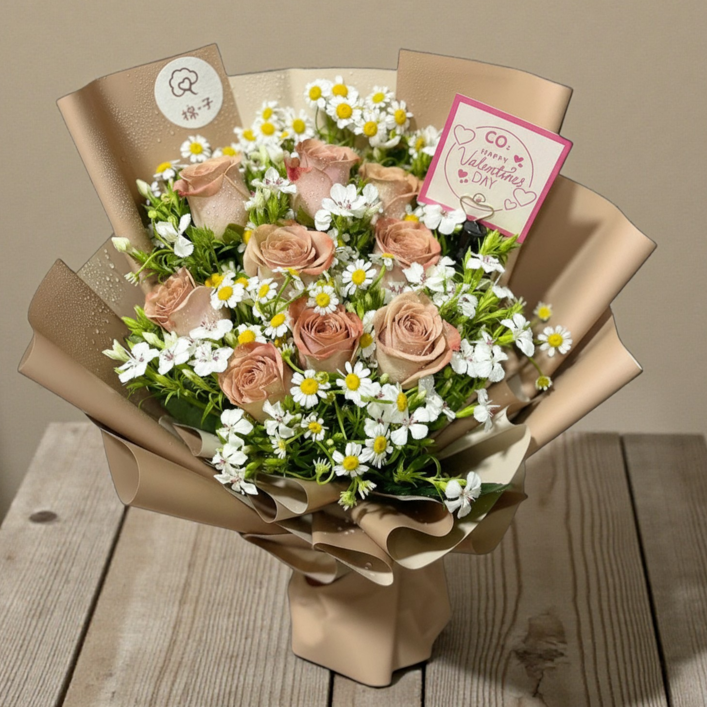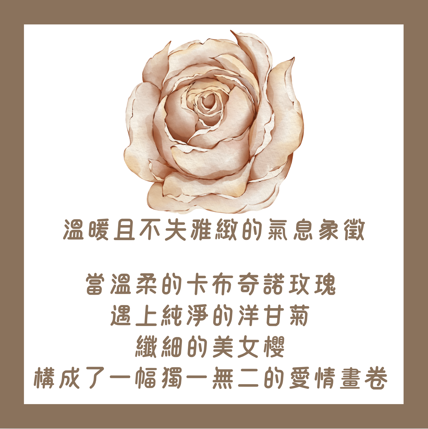 玫瑰象徵愛情;Cappuccino 玫瑰代表溫暖、柔美小雛菊花語:深深的愛在我的心底因為那個人和滿天星一樣,讓你見到就想親近與疼愛。 歡迎whatsapp直接落單 直接了解您的需要可whatsapp查詢:https://wa.me/67979350
