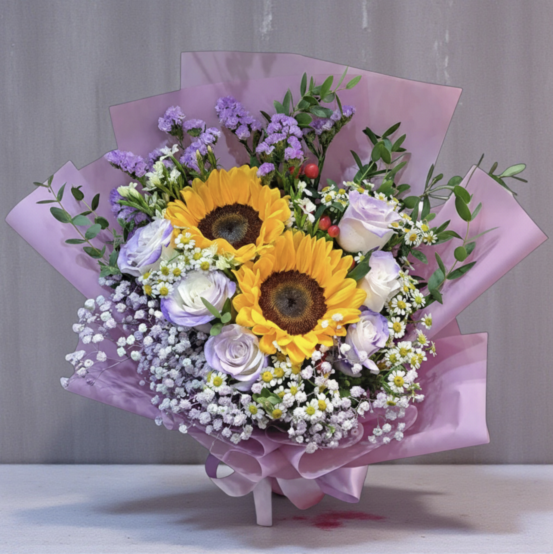闊40cm x 高 40cm (人手量度,約有輕微出入) 花材可能因季節性而作出變動,不影響主花為準 主花: 👉🏻向日葵 2支 👉🏻漸變紫色白色玫瑰 6支 👉🏻黃金球 👉🏻尤加利葉 花束詳細資料: 漸變紫色白色玫瑰與兩支向日葵的搭配,希望可以創造出: 1. *活力與希望*: 向日葵以其明亮的黃色和朝向太陽的特性,象徵著活力、希望和樂觀 與漸變紫色白色玫瑰的優雅和神秘相結合,為花束帶來了一種向上的力量 2. *和諧與對比* 漸變紫色白色的玫瑰提供了一種柔和的視覺過渡,而向日葵的明黃色則形成了鮮明的對比 這種和諧與對比的結合,使得花束在視覺上更加引人注目 3. *浪漫與自然* 紫色玫瑰帶來的浪漫氣息與向日葵的自然風格相得益彰,創造出一種既夢幻又真實的感覺 4. *高貴與親切* 紫色玫瑰的高貴與向日葵的親切和樂觀相結合,使得花束既有距離感又不失親和力 適合用於表達深摯的情感、祝福或對未來的期望 這樣的花束可以適應多種場合,從浪漫的約會到親密的家庭聚會,都能夠傳達出恰當的情感