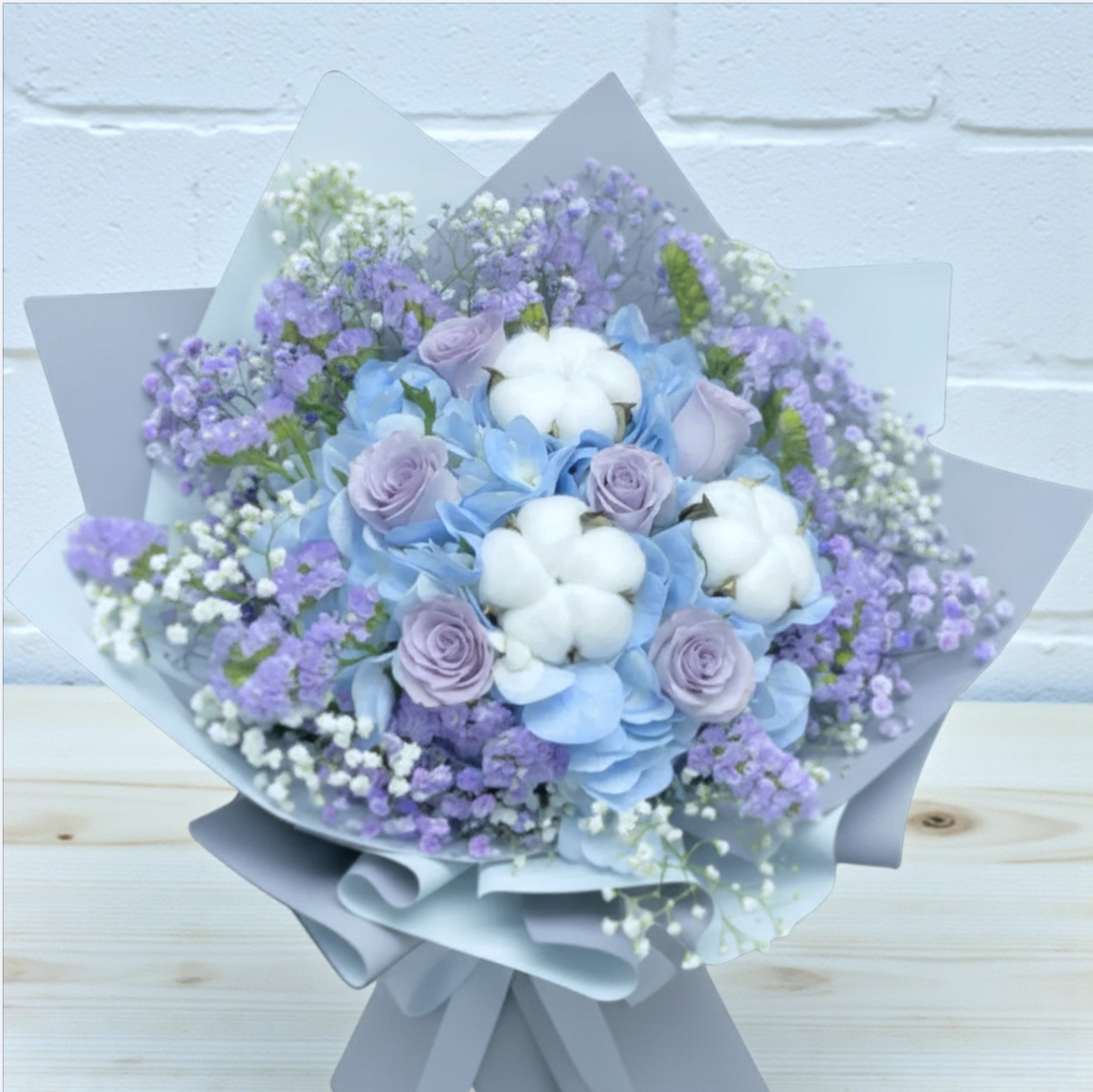 🙌鮮花花束 這束花束以淺藍繡球、紫玫瑰與棉花為主,搭配紫色小花與滿天星,整體呈現清新雅緻的視覺感受。淺藍繡球象徵著希望與平靜的愛,紫玫瑰代表著浪漫與尊貴,棉花則象徵著純潔與溫柔,紫色小花增添夢幻氛圍,滿天星則點綴出細膩的質感。 適用場合: 情人節:淺藍繡球象徵著純潔的愛情,紫玫瑰代表著浪漫的愛意,棉花則象徵著溫柔的關懷,是表達深情厚意的完美選擇 畢業禮:淺藍繡球代表著知識與智慧,紫玫瑰象徵著成就與尊貴,棉花則象徵著純潔的祝福,送給畢業生象徵著對他們未來的期望與支持 母親節:淺藍繡球代表著母愛的溫柔,紫玫瑰象徵著對母親的尊敬,棉花則象徵著母愛的純潔,是感謝母親辛勞的溫馨之選 生日花束:淺藍繡球代表著生日的喜悅,紫玫瑰象徵著祝福與尊貴,棉花則象徵著溫柔的生日願望,是慶祝生日的理想花束 紀念日花束:淺藍繡球象徵著紀念日的特別,紫玫瑰代表著愛情的堅定,棉花則象徵著紀念日的溫馨,是紀念重要時刻的完美花束