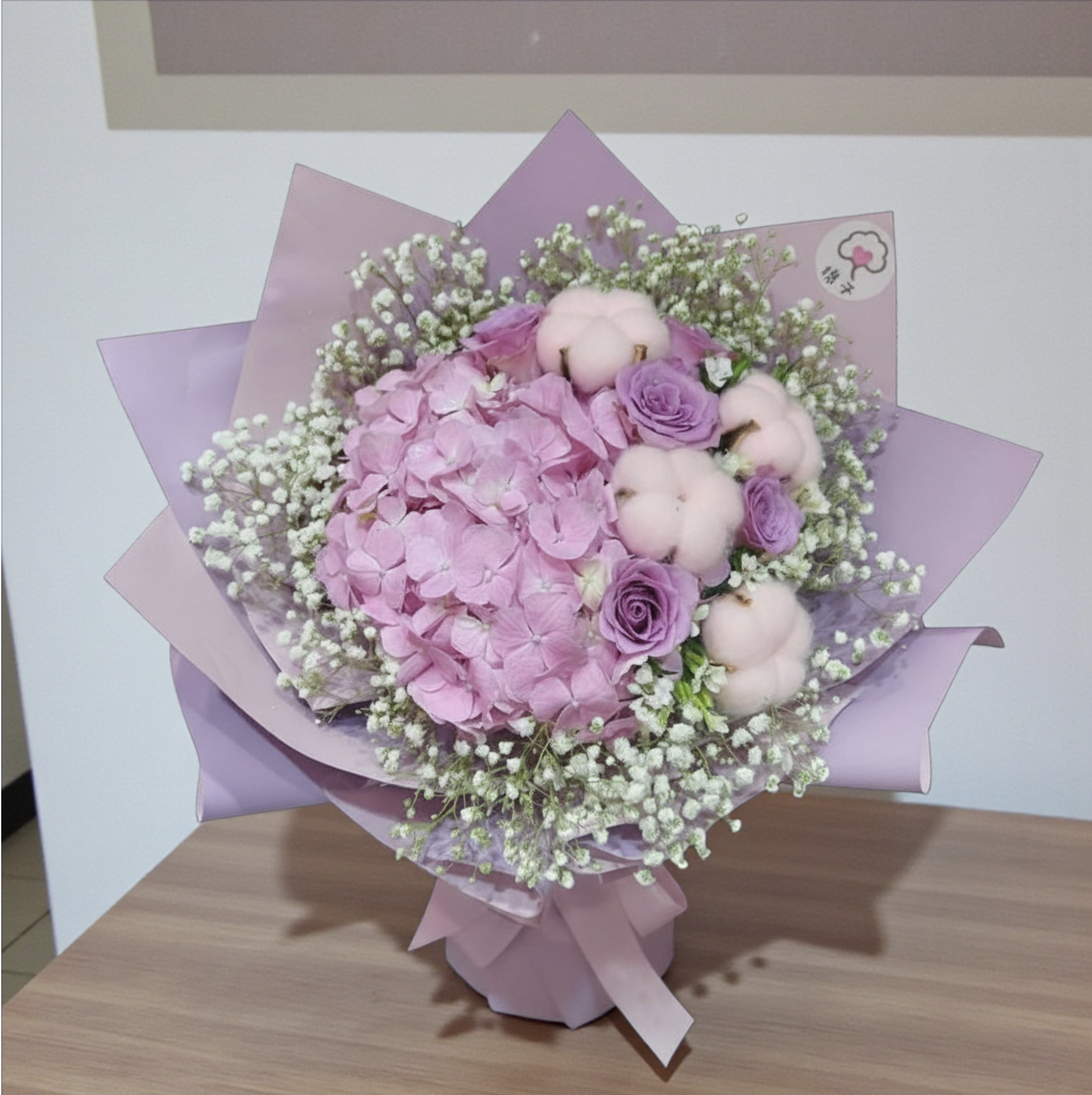 🙌鮮花花束 闊45-50cm x 高 45cm (人手量度,約有輕微出入) 這是一束溫柔浪漫的花束,以粉色繡球為主角,搭配淡紫色玫瑰與棉花,並點綴滿天星,整體呈現出柔美雅緻的氛圍。粉色繡球象徵著溫柔與愛意,淡紫色玫瑰代表著浪漫與尊貴,棉花則寓意著純淨與溫柔,滿天星增添夢幻感。花束用淡粉色包裝紙包裹,底部綁有同色系緞帶,精緻優雅。 適用場合: 情人節:粉色繡球與淡紫色玫瑰傳遞浪漫愛意,棉花象徵純淨情感,是表達深情厚意的完美選擇。 畢業禮:粉色繡球代表知識與智慧,淡紫色玫瑰象徵成就,棉花寓意純淨祝福,送給畢業生象徵對未來的期望與支持。 母親節:粉色繡球代表母愛的溫柔,淡紫色玫瑰象徵對母親的尊敬,棉花寓意母愛的純淨,是感謝母親辛勞的溫馨之選。 生日花束:粉色繡球代表生日的喜悅,淡紫色玫瑰象徵祝福與尊貴,棉花寓意溫柔願望,是慶祝生日的理想花束。 紀念日花束:粉色繡球象徵紀念日的特別,淡紫色玫瑰代表愛情的堅定,棉花寓意紀念日的溫馨,是紀念重要時刻的完美花束。