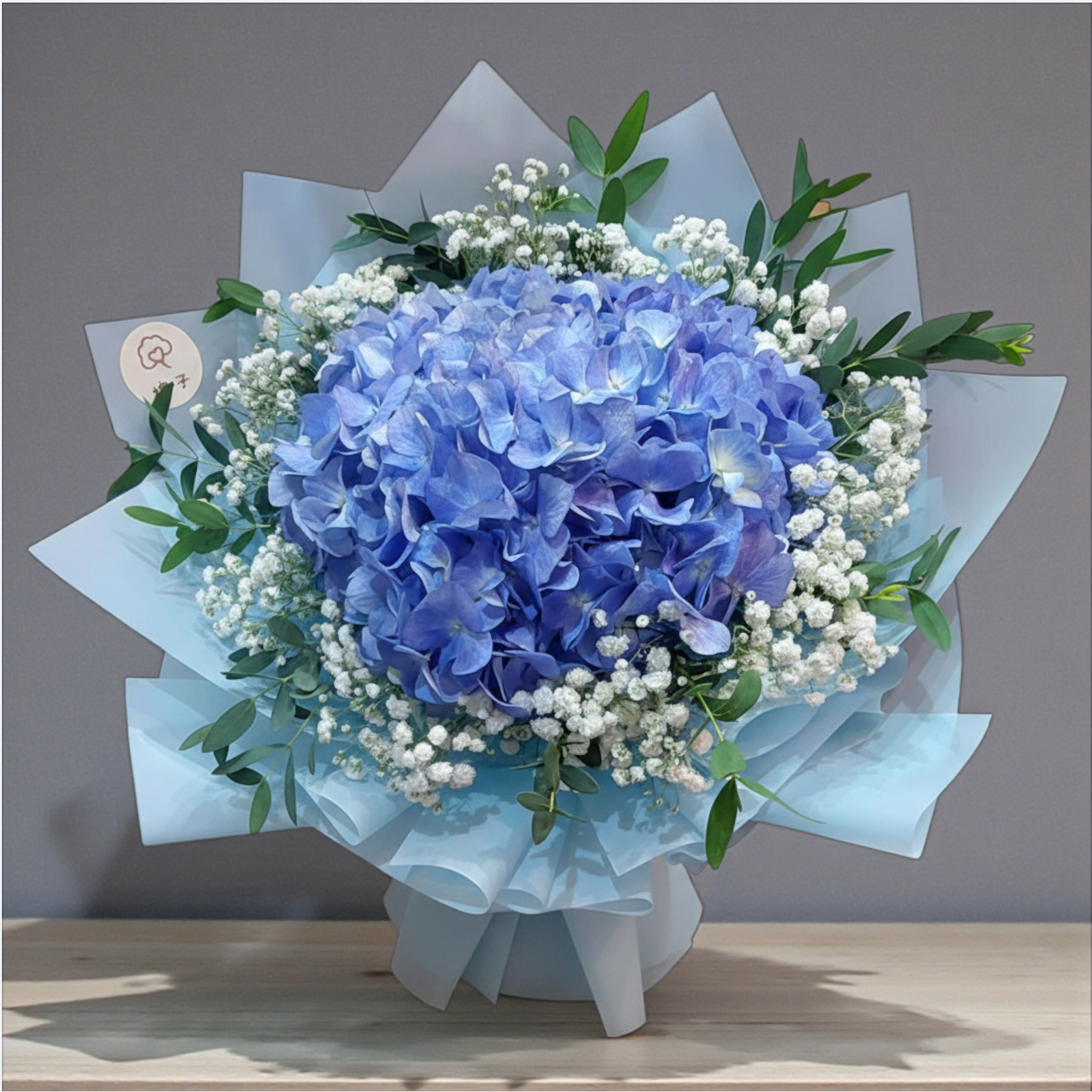 這是一束以深藍繡球為主角的精緻花束,搭配潔白的滿天星與翠綠的葉片,用淺藍色包裝紙包裹,整體呈現出清新雅緻的氛圍。 深藍繡球花語 浪漫與真摯:深藍色象徵著深沉、真摯的愛情 感激與感謝:表達對他人的深深謝意 寧靜與平靜:帶來心靈的平靜與祥和 夢想與希望:象徵著對未來的美好期盼 適用場合 情人節:深藍繡球代表著深沉而真摯的愛情,比紅玫瑰更含蓄內斂,適合表達長久穩定的感情。 畢業禮:象徵著對未來的憧憬與希望,祝福畢業生在人生新階段展翅高飛。 母親節:表達對母親深沉的感激與愛意,感謝她無私的付出。 生日花束:送給喜歡藍色或性格內向文靜的朋友,祝福他們擁有平靜幸福的生活。 紀念日花束:紀念重要時刻,象徵感情經得起時間考驗,歷久彌新。